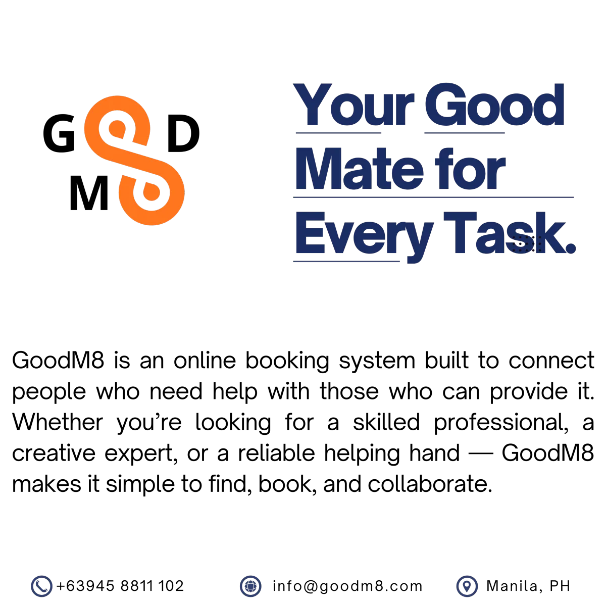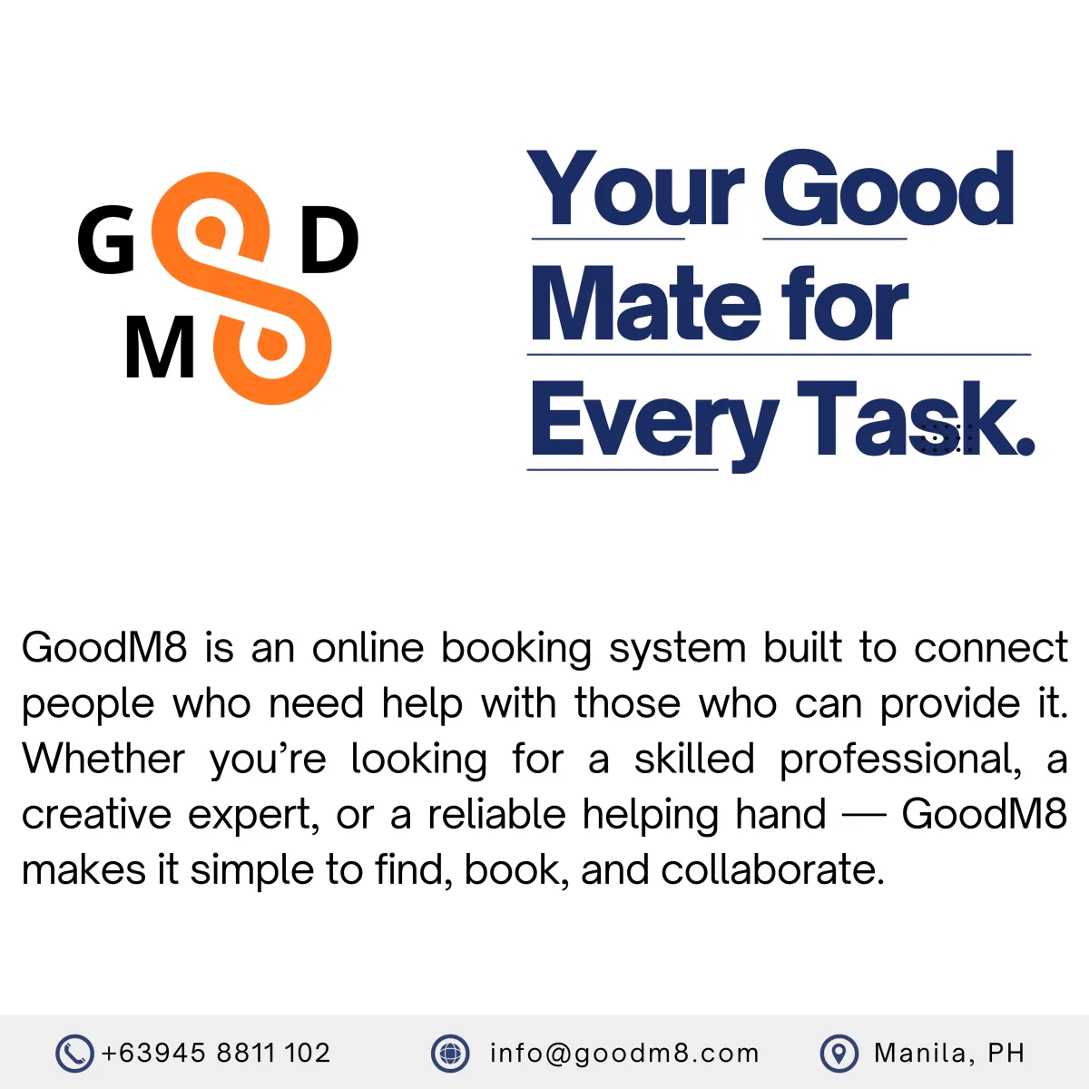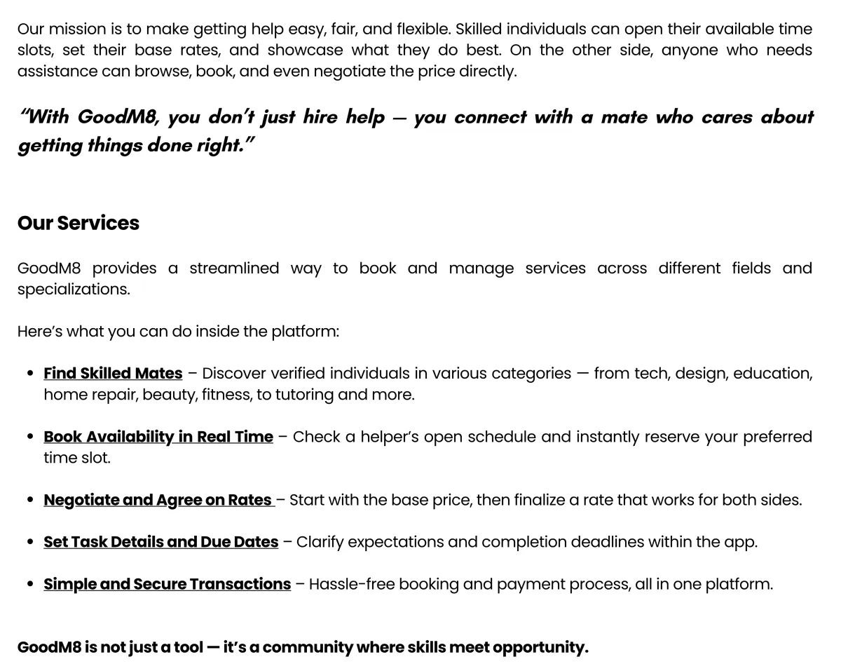 GoodM8 connects you with verified M8s across various fields from tech, design, and education to fitness, beauty, and personal coaching. Whether you need to learn, train, or get help with a task, you can easily find and book the right expert through the platform.